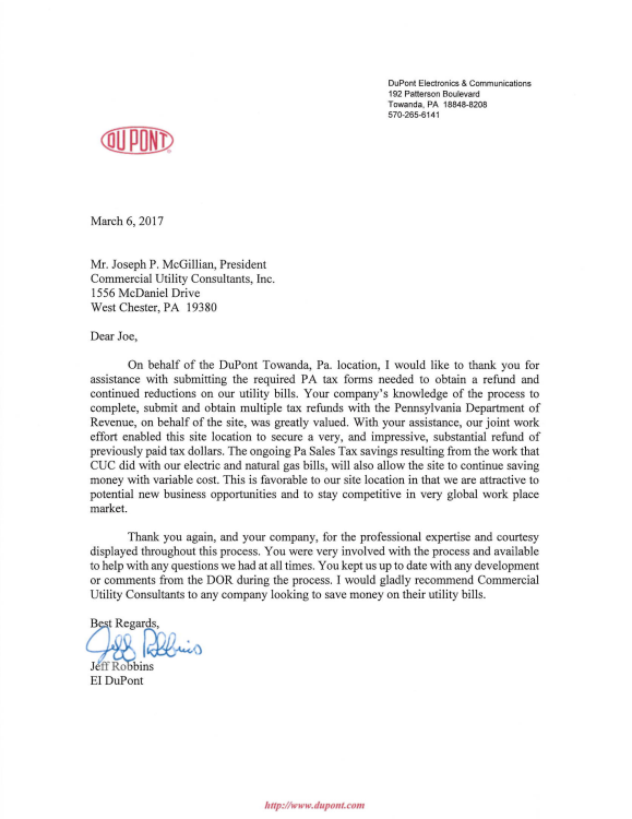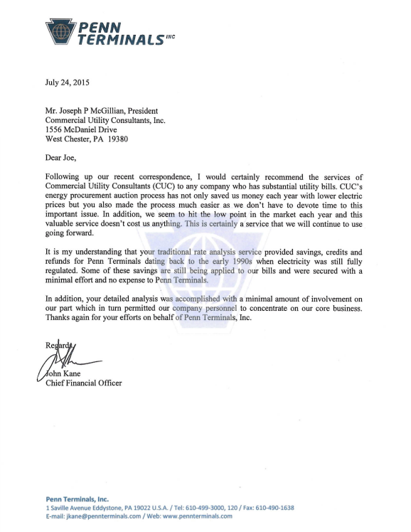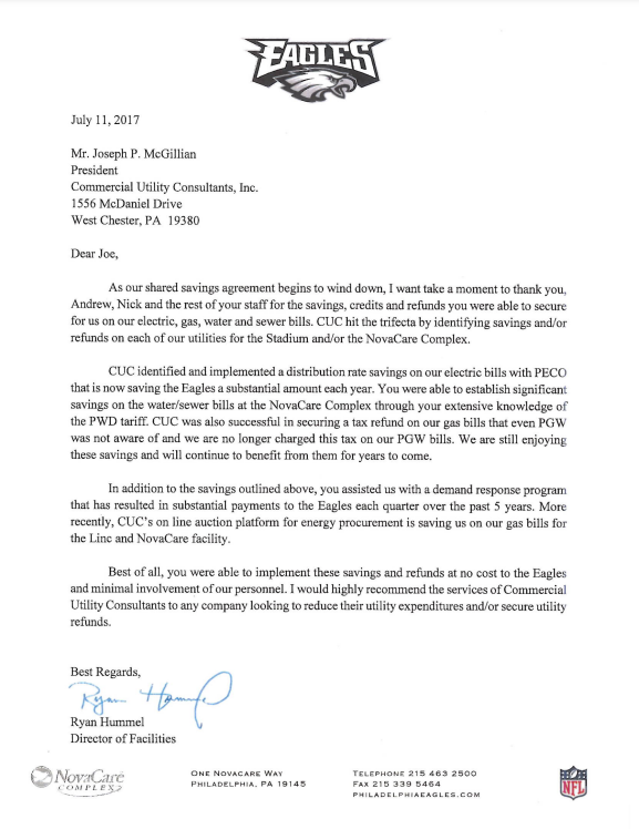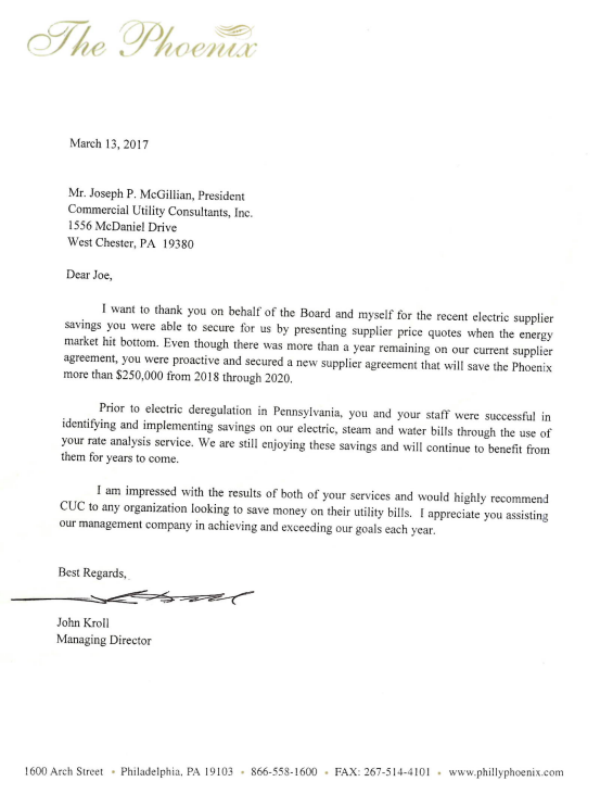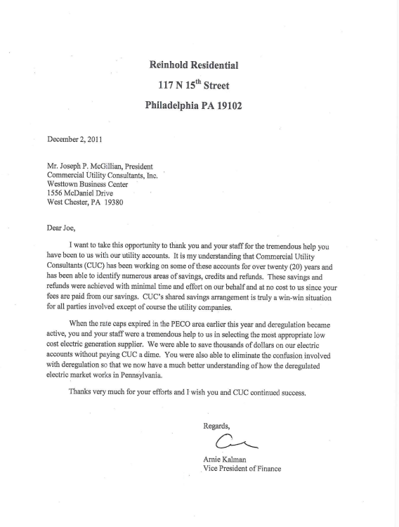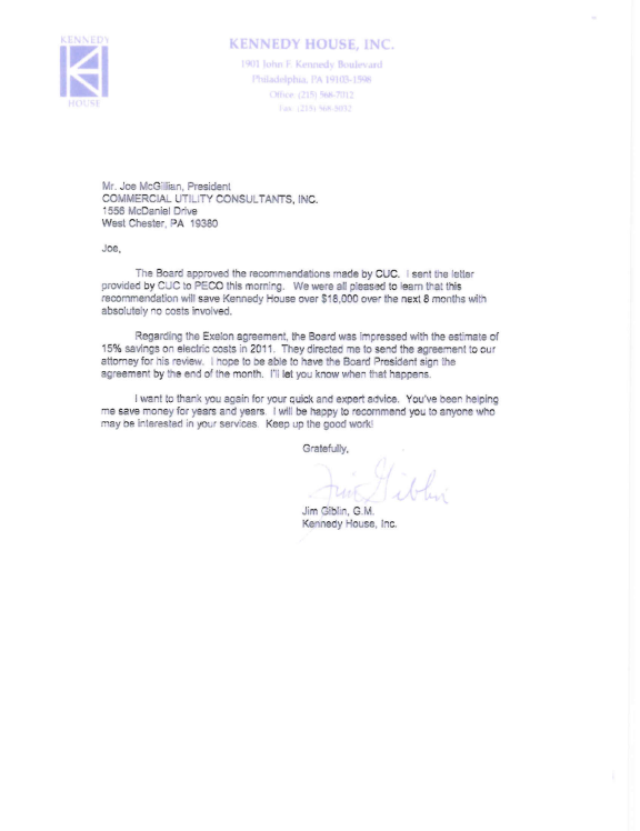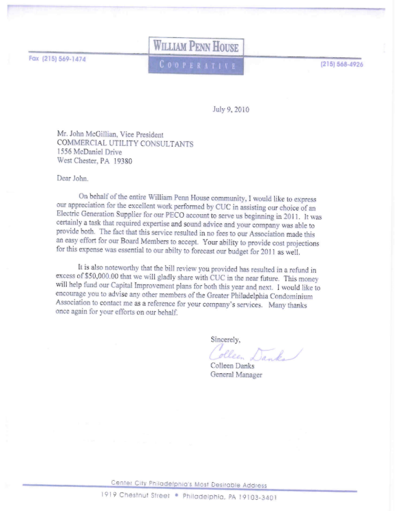 "The refund and credit from PECO totaling in excess of $130,000 would not have been possible without the expertise and determination of the employees of your company. I would give your organization a recommendation to anyone who is interested."