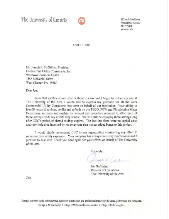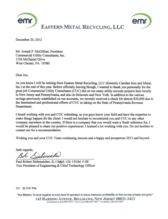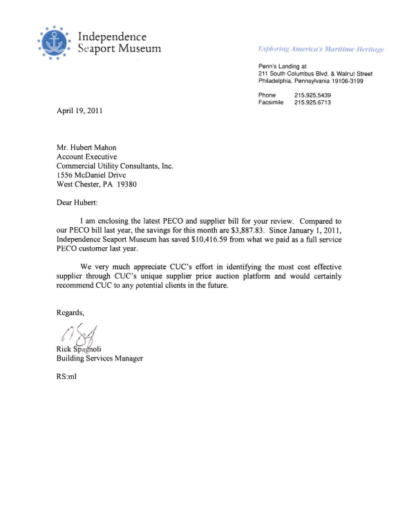 "Savings for the six-year period of our association have totaled an amount approaching $2,500,000. In addition, we continue to enjoy savings of more than $400,000 per year on our electric bills as a result of the efforts of Commercial Utility Consultants."